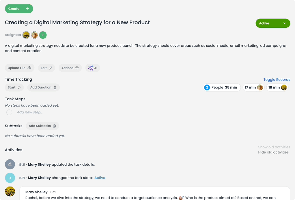 - Task Management: Create, assign, and track tasks with clear owners, priorities, and deadlines.