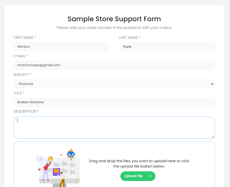 - The client fills out the form with their name, surname, e-mail, subject, title, description, and any relevant files.